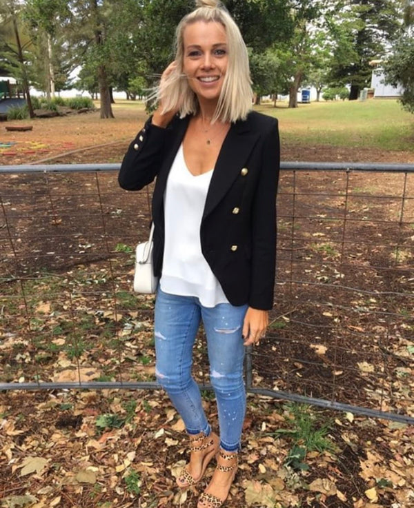 This blazer is absolutely KILLER – the gold statement buttons are so on trend right now. Wear it with denim or shorts for the ultimate girl boss look. Palermo Blazer  Lined throughout Double breasted jacket Gold-toned buttons at the front and...