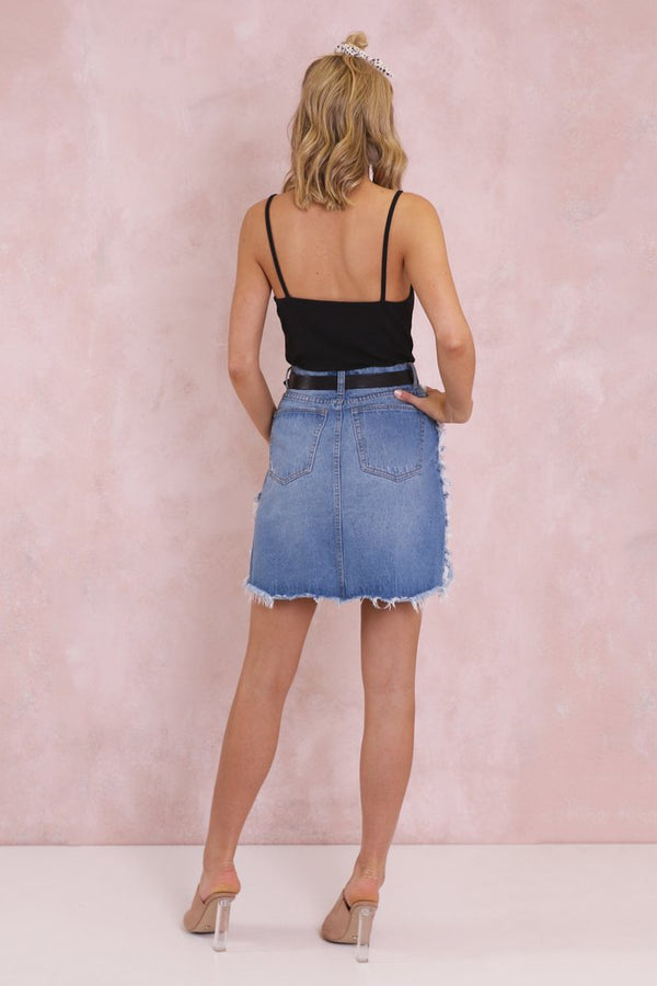 Denim blues of the best kind, the California skirt is about to be your summer MVP. Featuring a high waisted silhouette with asymmetrical hem, heavy distressing and dramatic fray detailing, this mini highlights your curves in all the right places....